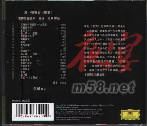 夜宴電影原聲大碟(m58.net) 奧斯卡音樂大師譚盾與國(guó)際年輕鋼琴大師郎朗攜手締造音樂盛宴 超級(jí)女聲張靚穎主唱 電影主題歌1(我用所有報(bào)答愛)(越人歌)4周迅 主唱(寂寞版)式1騰格爾主唱(復(fù)仇版) 凄美感人史詩式巨作 電影(夜宴)的原聲音樂大碟是以(臥虎藏龍)榮獲奧斯卡和格林美音樂大獎(jiǎng)的中國(guó)作曲/指揮家譚盾,最新完成的非凡之作.(夜宴)的故事發(fā)生在10世紀(jì)的中國(guó)唐代,取材于莎士比亞的(王子復(fù)仇記),是一部講述愛情、背叛與謀殺的影片。譚盾將這部最新力作描述為“既古典又現(xiàn)代,既有浪漫的旋律又有震撼人心的節(jié)奏”。這部奧斯卡音樂大師的史詩巨作,融匯了東西方文化的精髓,締造了磅礴的視聽盛宴。