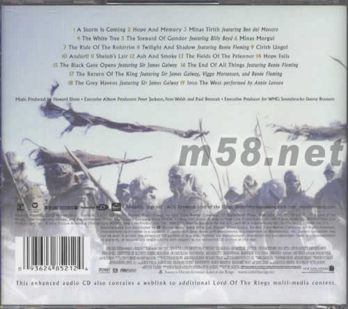 1、A STROM IS COMING 2、HOPE AND MOMORY 3、MINAS TIRITH FEAURING BEN DEL MAESTRO 4、THE WHITE TREE 5、THE STEWARD OF GONDOR FEATURING BILLY BOYD 6、MINAS MORGUL 7、THE RIDE OF THE ROHIRRIM 8、TWILIGHT AND SHADOW FEATURING RENEE FLEMING 9、CIRITRH UNGOL 10、ANDURIL 11、SHELOB‘S LAIR 12、ASH AND SMOKE 13、THE FIELDS OF THE PELENNOR 14、HOPE FAILS 15、THE BLACK GATE OPENS FEATRUING SIR JAMES GALWAY 16、THE END OF ALL THINGS FEATRUING RENEE FLEMING 17、THE RETRURN OF THE KING FEATURING SIR JAMES GALMWAY VIGGO MORTENSEN AND RENEE FLEMING 18、THE GREY HAVENS FEATURING SIR JAMES GALWAY 19、INTO THE WEST PERFORMED BY ANNIE LENNOX