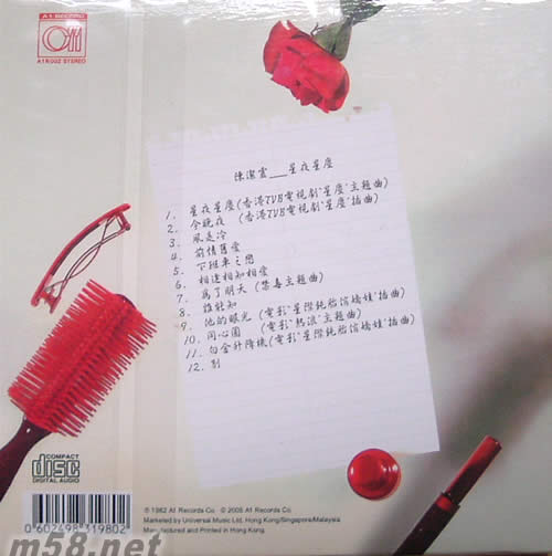 01. 星夜星塵(香港TVB電視劇'星塵'主題曲) 02. 今晚夜(香港TVB電視劇'星塵'插曲) 03. 風是冷 04. 前情舊愛 05. 下班車之戀 06. 相逢相知相愛 07. 為了明天(禁毒主題曲) 08. 誰能知 09. 他的眼光(電影'星際鈍胎俏嬌娃'插曲) 10. 同心圓(電影'熱浪'主題曲) 11. 白金升降機(電影'星際鈍胎俏嬌娃'插曲) 12. 別