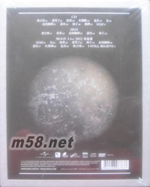 CD 01. 無言歌 02. 愛笑了 03. 枯榮 (粵語(yǔ)) 04. 紅眼眶 05. 也許 06. 灰 07. 寂寞擁擠 08. 蓋亞 09. 柿子 10. 假釋 11. Stay DVD MV 01. 無言歌 02. 枯榮 03. 寂寞擁擠 04. 蓋亞 05. 柿子 MOOV Live 2012 林憶蓮 01. Stay 02. 灰 03. 枯榮 04. 愛笑了 05. 柿子 06. 寂寞擁擠 07. 蓋亞 08. 紅眼眶 09. 也許 10. 無言歌 11. I Still Believe