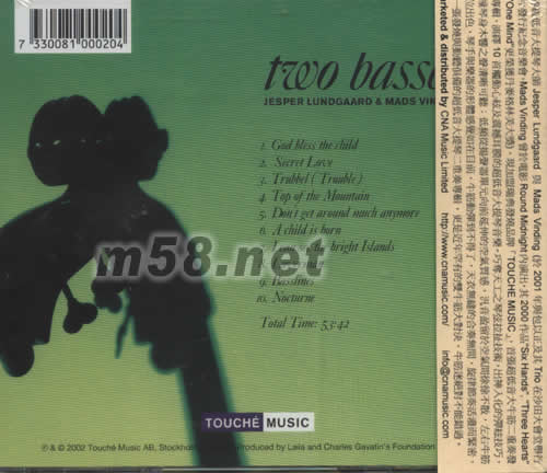 世界給低音大提琴大師 JESPER LUNDGAARD與MADS VINDING(于2001年與包以正及其TRIO在沙田大會堂舉行唱片發行紀念音樂會.MADS VINDING曾于電影ROUND MIDNIGHT內演出,其2000作品"SIX HANDS","THREE HEARTS"EY "ONE MIND"更榮獲丹麥格林美大獎),現加盟瑞典發燒品牌[TOUCHE MUSIC],首張超低音大牛筋二重奏發燒專輯,演繹10首觸動心弦及震撼耳膜的超低音大提琴音樂. 巧奪天工之琴弦拉扯技術,出神入化的強弦技巧,弦撞琴身木響之聲清晰可聽; 低頻從揚聲器單元向前延伸的空氣質感,泛音盈留于空氣問徐徐不散,左右牛筋定位出色,琴手與樂器的形體感覺如在目前,牛筋動強到不得了,天衣無縫的合奏無間,旋律節奏活潑而緊密,是一張發燒與動聽俱備的超低音大提琴二重奏專輯,更是近年罕有的雙牛筋大對決,牛筋迷絕對不能錯過.