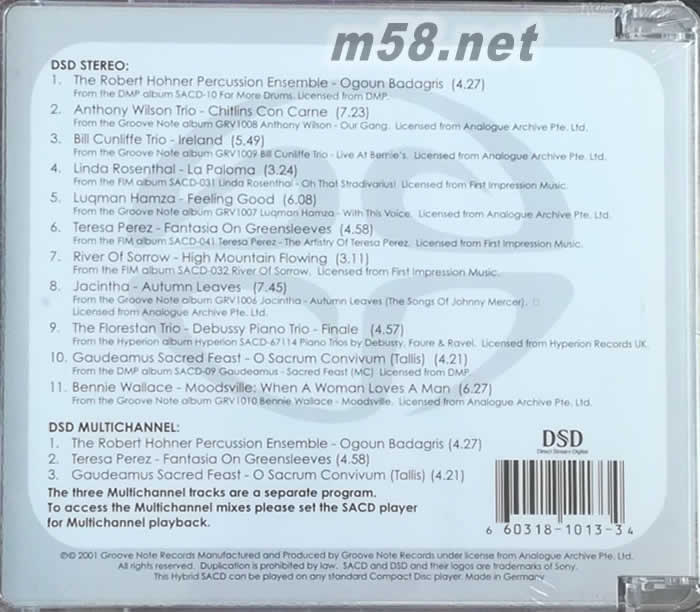 如果您有幸擁有多聲道SACD唱盤,請您一定得聽聽Groove Note公司特別制作的第1、6與10軌音樂,什么才是未來Hi End訊源的終極追求?這三軌音質音效好得不像話的音樂,已經為您找到了明確的答案。
