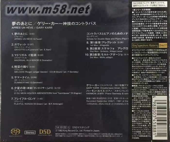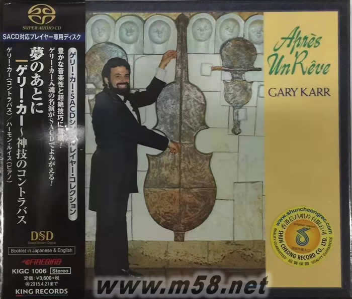 低音大提琴 歌劇詠嘆調 單層SACD 僅限SACD機播放(m58.net) 1962年,蓋瑞卡爾在紐約卡內基音樂廳由伯恩斯坦指揮紐約愛樂下首演,他精湛的演奏,高超的技巧,因此一炮而紅。以獨奏家的演奏生涯中,紐約的首演是他的重大轉捩點。從此他以獨奏家身分走遍六大洲,合作過的國際樂團如:紐約愛樂、芝加哥交響樂團、倫敦愛樂、倫敦交響樂團、巴黎愛樂、蒙特婁交響樂團、多倫多交響樂團、委內瑞拉卡拉卡斯的西蒙玻利瓦樂團、耶路撒冷交響樂團、奧斯陸愛樂、蘇黎世室內樂團、香港愛樂、臺灣的國家音樂廳交響樂團、以及澳洲的各大交響樂團等。蓋瑞卡爾於低音提琴的成就是一項傳奇中的傳奇。義大利的有線電視曾轉播三場卡爾的低音提琴獨奏會給兩千萬古典音樂愛好者欣賞,而卡爾在日本由King唱片所發行的許多錄音,在亞洲地區長久以來一直是排行榜上的常客。美國的CBS曾為蓋瑞卡爾錄製Camara Three專輯於Bell Telephone Hour節目中播出;在加拿大,CBC電視臺製作了Gary Karr and his friend系列節目;在英國的Channel 4電視臺也曾錄製一系列的兒童節目Bass is Beautiful;在1985年英國BBC製作了兩集影片,一個是介紹卡爾的音樂及生活"Amazing Bass",另一個是為兒童所作的專輯;在卡爾與倫敦交響樂團的第三張錄音中,錄製了英國作曲家約翰道尼的低音提琴協奏曲;美國CBS的Sunday Morning節目曾專題介紹卡爾的成就;威斯康辛大學亦發行了一卷介紹蓋瑞卡爾於低音提琴的獨到見解BASSically Karr和一卷特別的兒童音樂會Karrtunes。這些是蓋瑞卡爾眾多成就的一小部份。蓋瑞卡爾最自豪的一項成就是由名女高音羅莎朋賽兒基金會(Rosa Poselle Foundation)所頒發的金牌獎,這證明蓋瑞卡爾不僅是一位低音提琴家,他的音樂的歌唱性令他獲得這個專屬於聲樂家的成就。