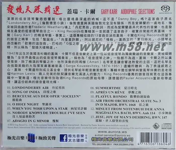 1942年出生於美國洛杉磯的蓋瑞.卡爾不但是音樂史上第一位以低音提琴為獨奏樂器的音樂家,更被媒體譽為「全世界最杰出的低音提琴獨奏家」,稱他為「低音提琴之神」一點都不為過。蓋瑞.卡爾之所以廣受推崇,除了精湛的琴藝之外,他所演奏的阿瑪悌(Amati)名琴更是讓音響迷熱愛的主因。這把名琴是由俄裔美籍的大指揮家?guī)烊S斯基(Serge Koussevitzky, 1874-1951)遺孀所贈與,為了表達(dá)感恩之心,蓋瑞.卡爾還特別成立基金會,提供名琴給年輕音樂家使用。專輯中擔(dān)任鋼琴與管風(fēng)琴伴奏的是老搭檔Harmon Lewis,兩人完美的默契讓音樂充滿迷人的魅力,King Records優(yōu)異的錄音技術(shù)更在這張專輯中一覽無遺。極光音樂特別取得King Records的原始母帶,請德國的Pauler Acoustics重新母帶處理,讓這份經(jīng)典的錄音重現(xiàn)光輝。
