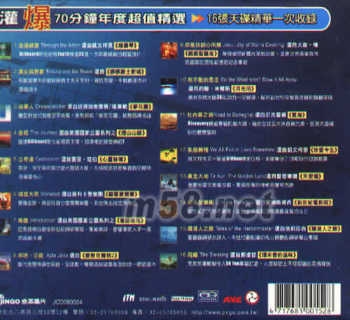1、走過綠意Through the Arbor選自凱文柯恩《綠鋼琴》 BILLBOARD新世紀榜TOP10蟬聯26周,今年最暢銷的超強猛片! 2、美女與野獸 Beauty and the Beast選自《娜娜爵士影城》 希臘國寶天后娜娜與爵士天王享利。貝拉方提,千載難逢同臺竟選版本 3、追夢人 Dreamcatcher選自班得瑞樂團第七張專輯《夢花園》 屢登新世紀銷售冠軍樂團,挑戰挪威[秘密花園]銷售百萬名曲 4、旅程The Journey選自美國國家公園系列之《煙山山脈》 盤隊BILLBOARD新世紀榜霸王碟,超爆棚的綠音典苑! 5、古奇連Cuchulainn選自雷恩。寇伯《心靈秘境》 李安、吳宇森欽點的當代魔笛大師,大格局史詩音樂直島克雨特音樂最核心 6、傾盆大雨 Monsoon選自貝利卡登樂團《顛覆愛爾蘭》 驚爆全歐,叛逆附身的愛爾蘭樂團,來臺演出指定演奏曲 7、鳥瞰 Introduction選自美國國家公園系列之《優勝美地》 亞馬遜綱站最佳新世紀鋼琴專輯。專業樂評、音響專家人手一張的超級天碟 8、來吧,亞諾Ajde Jano選自《愛戀克爾特2》 當代克爾特曠世名曲,全球數十種翻唱皆望塵莫及的唯一原唱版本 9、你是我誠心所愿Jesu, Joy of Man’s Desiring選自大街。楊 《親親圣誕夜》華視夜間新聞片尾指定曲,受邀白宮演奏首席長笛家的跨世紀感恩紀念專輯 10、吹不散的思念 So the Wind Won’t Blow it All Away選自約翰。米爵斯《月光河》 澳洲吉他大師30年功力一次展現,探究新世紀音樂最澄靜的精隨本味 11、杜內嘉之路Road to Doneghal選自尼吉霍頓《云海》 DISCOVERY頻道專屬配樂大師,融合全球五大洲音樂元素,呈現大瞻精彩的聽覺冒險 12、熟能無情We All Fall in Love Sometime選自凱文柯恩《珍愛今生》凱文柯恩又一榮登BILLBOARD排行榜,全球樂迷引進期盼的超強靚碟 13、黃金大地Tir Aur- The Golden Land選自圣恩樂團《天使魂》華麗多層次美聲吟唱,重現失傳的神秘克爾古語 14、新天碟樂團Cinema Paradiso選自安納斯塔西《新世紀電影院》新世紀九人室內樂團,激發金獎電影主題曲最璀爛的光芒 15、擺渡人之歌 Tales of the Harbormaster選自依莉莎白《擺渡人之歌》重量級鋼琴女詩人,本世紀最能讓你掏心傾聽的鋼琴獨白專輯 16、祝福 The Blessing選自郭虔哲《爆米香的滋味》 馬友友專輯制作人ED YEN專屬打造,大提琴史上不可思義的柔情釋放