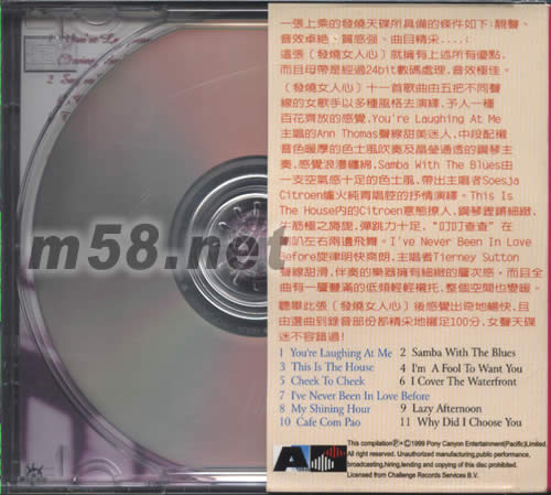 價格為估,以實到貨為準! 發燒女人心HEART OOF WOMEN(m58.net) 一張上乘的發燒天碟所具備的條件如下:靚聲效卓絕.質感強.曲目精采、、、: 這張[發燒女人心]就擁有上述所有優點,而且母帶是經過24DIT 數碼處理,音效極佳。 [發燒女人心]十一首歌曲由五把不同聲線的女歌手以多種風格去演釋,予人一種百花齊放的感覺,YOU RE LAUGHING AT ME主唱的ANN YHOMAS聲線甜美迷人,中段配襯音色暖厚的色士風吹奏及晶瑩通透的鋼琴主奏,感覺浪漫纏綿,SAMDA WITH YHE BLUES由一支空氣感十足的色士風,帶出主唱者SOESJA CITROEN爐火純青唱腔的抒情演釋.THIS IS THE HOUSE內的CITROEN意態撩人,鋼琴鏗鏘細致,牛筋極之旖旎,彈跳力十足,"叮叮查查"在喇叭左右兩邊飛舞.I'VE NEVER BEEN IN LOVE BEFORE 旋律明快爽朗,主唱者TIERNEY SUTTON 聲線甜滑,伴奏的樂器擁有細致的層次感,而且全曲有一層豐滿的低頻輕輕襯托,整個空間也變暖.聽畢此張[發燒女人心]后感覺出奇地暢快,且由選曲到錄音部份都精采地擺足100分,女聲天碟迷不容錯過!