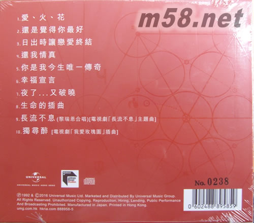 1.愛、火、花 2.還是覺得你最好 3.日出時讓戀愛終結 4.還我情真 5.你是我今生唯一傳奇 6.幸福宣言 7.夜了...又破曉 8.生命的插曲 9.長流不息(黎瑞恩合唱) [電視劇「長流不息」主題曲] 10.獨尋醉 [電視劇「我愛玫瑰園」插曲]