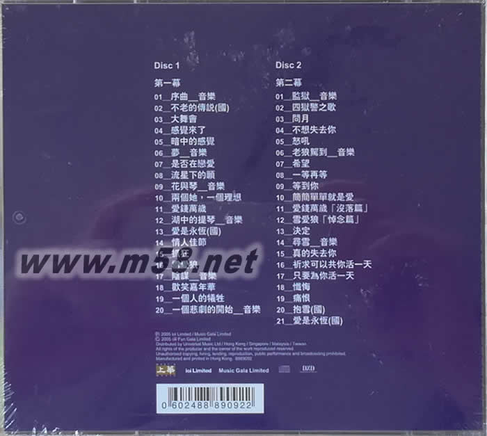 CD1 01.序曲(音樂) 02.不老的傳說-張學(xué)友(國) 03.大舞會-張學(xué)友/許慧欣/于毅/陳潔儀/杜鶴/田寧/蔡鵬/黃敏豪/陳剛/陳家/孫曉明/月亮/桑芳菲/吳佳佳/周嶺/朱江/劉可/鄒暢/張煒/張晶 04.感覺來了-張學(xué)友 05.暗中的感覺-陳潔儀 06.夢(音樂) 07.是否在戀愛-張學(xué)友 08.流星下的愿-張學(xué)友/許慧欣 09.花與琴(音樂) 10.兩個她,一個理想-許慧欣/陳潔儀 11.愛錢萬歲-杜鶴/于毅/黃敏豪/陳剛/陳家/孫曉明/月亮/李珊珊 12.湖中的提琴(音樂) 13.愛是永恒(國)-張學(xué)友/許慧欣 14.情人佳節(jié)-張學(xué)友/許慧欣/于毅/陳潔儀/辜競/蔡鵬/黃敏豪/陳剛/陳家/孫曉明/月亮/桑芳菲/文瑩/王若卉/周嶺/朱江/劉可/鄒暢/張煒/張晶 15.抓狂-張學(xué)友 16.雪愛狼-許慧欣/張學(xué)友 17.陰謀(音樂) 18.歡笑嘉年華-張學(xué)友/許慧欣/辜競/蔡鵬/黃敏豪/陳剛/陳家/孫曉明/月亮/桑芳菲/文瑩/王若卉/周嶺/朱江/劉可/鄒暢/張煒/張晶 19.一個人的犧牲-張學(xué)友 20.一個悲劇的開始(音樂) CD2 01.監(jiān)獄(音樂) 02.四獄警之歌-杜奕衡/蔡鵬/陳剛/陳家 03.問月-張學(xué)友/黃敏豪/辜競/丁一/肖烈剛/田寧/曹廣海 04.不想失去你-張學(xué)友 05.怒吼-張學(xué)友/黃敏豪/辜競/丁一/肖烈剛/田寧/曹廣海 06.老狼駕到(音樂) 07.希望-于毅/張學(xué)友 08.一等再等-陳潔儀 09.等到你-陳潔儀 10.簡簡單單就是愛-張學(xué)友/陳潔儀/黃敏豪/吳佳佳/蔡鵬/陳剛/陳家/桑芳菲/谷立亞/月亮/遲霜霜/曹廣海/周嶺/朱江/劉可/鄒暢/張煒/張晶 11.愛錢萬歲(沒落篇)-杜鶴/吳佳佳/桑芳菲/遲霜霜/黃敏豪/蔡鵬/曹廣海 12.雪愛狼(悼念篇)-許慧欣 13.決定-張學(xué)友 14.尋雪(音樂) 15.真的失去你-張學(xué)友 16.祈求可以共你活一天-陳潔儀 17.只要為你活一天-張學(xué)友 18.懺悔-許慧欣 19.痛恨-于毅/許慧欣 20.抱雪-張學(xué)友 21.愛是永恒(國)-張學(xué)友/許慧欣/黃敏豪/曹廣海/吳佳佳/桑芳菲/孫曉明/月亮/遲霜霜/周嶺/朱江/劉可/鄒暢/張煒/張晶