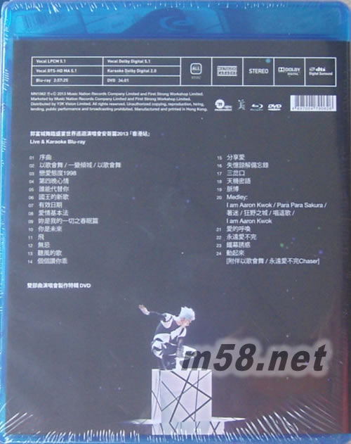Live & Karaoke Blu-ray 01. 序曲 02. 以歌會舞 / 一變傾城 / 以歌會舞 03. 戀愛態(tài)度1998 04. 第四晚心情 05. 誰能代替你 06. 國王的新歌 07. 有效日期 08. 愛情基本法 09. 妳是我的一切之春眠篇 10. 你是未來 11. 飛 12. 無忌 13. 聽風(fēng)的歌 14. 個個贊你乖 15. 分享愛 16. 失憶諒解備忘錄 17. 三岔口 18. 天機(jī)密語 19. 脈博 20. Medley: I am Aaron Kwok / Para Para Sakura / 著迷 / 狂野之城 / 唱這歌 / I am Aaron Kwok 21. 愛的呼喚 22. 永遠(yuǎn)愛不完 23. 鐵幕誘惑 24. 動起來 [附伴以歌會舞 / 永遠(yuǎn)愛不完Chaser) Bonus DVD 雙部曲演唱會制作特輯 (34mins)