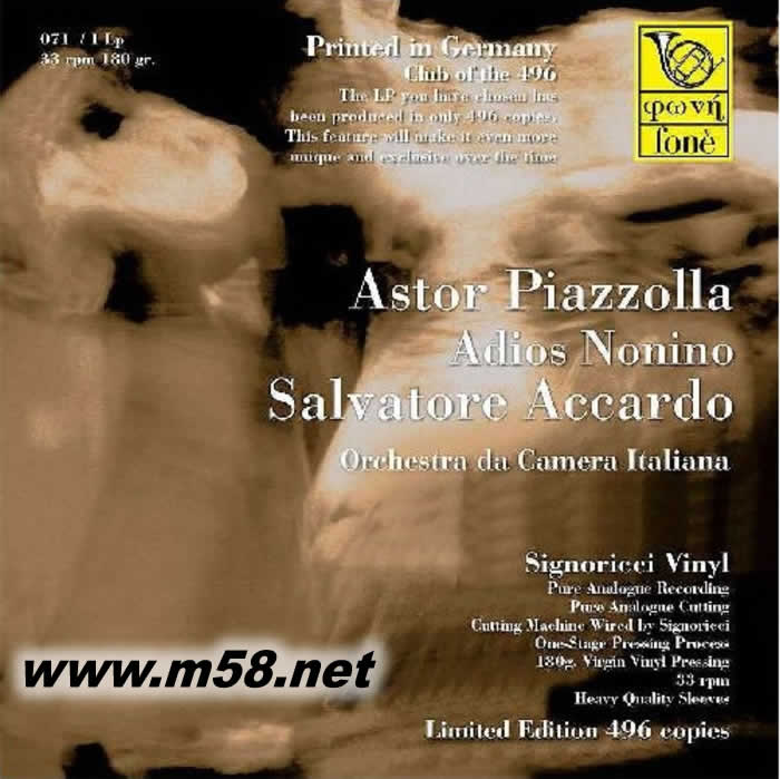 出生於阿根廷的探戈天王皮亞佐拉(Astor Piazzolla)雙親是意大利人,他的童年時代在美國紐約渡過,他在這里學習到西班牙文、法文及意大利文,這文化背景影響他后來在文化藝術的創作致深。另一探戈天王加戴爾(Carlos Gardel)對他十分賞識,視他為音樂天才。皮亞佐拉於1953因作曲比賽中得獎,其中一項獎品是到巴黎深造,他跟隨當時法國最著名作曲家布朗熱(Nadia Boulanger)學習作曲,自此便改變他的余生。探戈舞及其音樂是阿根廷的文化圖像,皮亞佐拉曾創作不少同類音樂但並未能如他在歐美等地得到的重視,但自他於1992年過身之后,他的音樂才得國人日漸的認同。意大利小提琴一代宗師阿卡多(Salvatore Accardo)擁有超然的樂壇地位,出神入化的琴技往往令人聽得熱血沸騰渾身充滿動感,仿如人琴合一般的演奏絕對無人能及,技術銳不可擋。阿卡多配合"意大利室樂團(Orchestra da Camera Italiana)"於2001年5月一個不經刪剪的現場實況錄音,帶來皮亞佐拉的精選作品包括[再見,諾尼諾(Adios Nonino)]、[布宜諾斯艾利斯的夏天(Verano Porteno)]、[圣母頌(Tanti Anni Prima)]及[給卡瑪拉樂團的三首作品(Tres Piezas Para Orcuesta De Camera)],現以33 1/3轉,180克,以處女膠單一階段式壓片(one-stage pressing)的黑膠盤為載體呈獻,后期全在德國製造,全球限量496套,極之珍貴