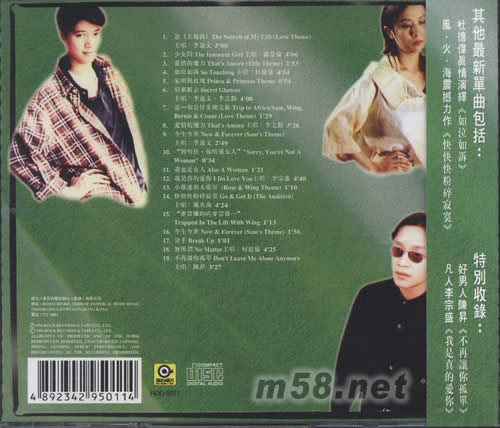 01. 追 (主題曲) The Search of My Life(Love Theme) 主唱:李迪文 02. 少女問(wèn) The Innocent Girl 主唱:蘇慧倫 03. 愛(ài)情的魔力 That s Amore(Title Theme) 04. 如泣如訴 So Touching 主唱:杜德偉 05. 家明與玫瑰 Prince & Princess Theme 06. 眉來(lái)眼去 Secret Glances 主唱:李迪文 李之勤 07. 追-布公仔非洲之旅 Trip to Africa/Sam,Wing,Bernie&Count(Love Theme ) 08. 愛(ài)情的魔力 That s Amore 主唱:李之勤 09. 今生今世 Now&Forever(Sam s Theme) 主唱:李迪文 10. "對(duì)唔住,你唔系女人" "Sorry,You re Not A Woman" 11. 我也是女人 Also A Woman 12. 我是真的愛(ài)你 I Do Love You 主唱:李宗盛 13. 小歌迷與大歌星(Rose&Wing Theme) 14. 快快快粉碎寂寞 Go&Get It(The Audition) 主唱:風(fēng)火海 15. "麥當(dāng)娜約咗麥當(dāng)雄..." Trapped In The Lift With Wing 16. 今生今世 Now&Forever(Sam s Theme) 17. 分手 Break Up 18. 無(wú)所謂 No Matter 主唱:何超儀 19. 不再讓你孤單 Don t Leave Me Alone Anymore 主唱:陳升