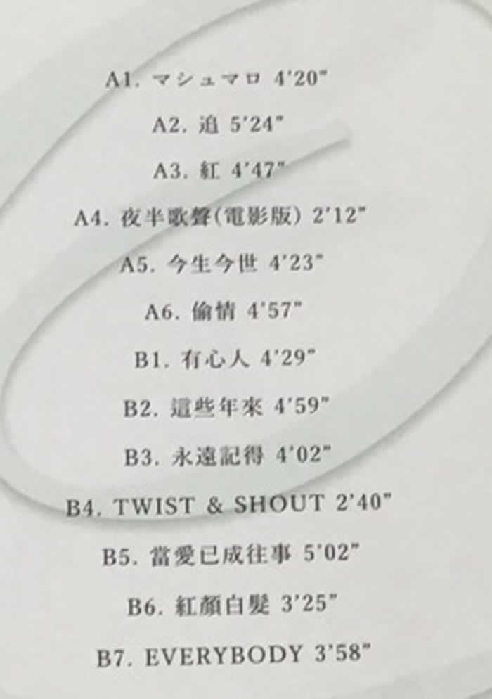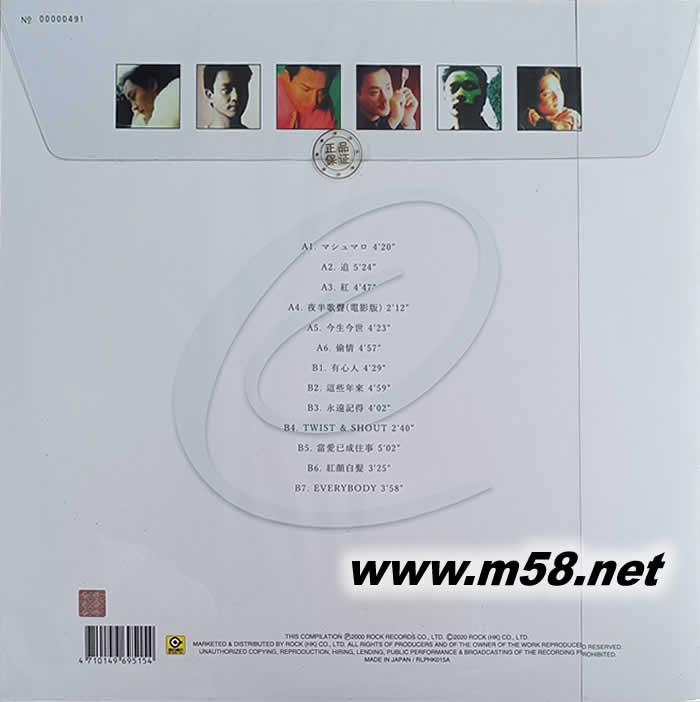 張國榮精選The Best Of Leslie Cheung 黑膠 限量版(m58.net) 1999年張國榮與常盤貴子合演的電影《星月童話》,在日本上映時掀起熱潮,有見及此,滾石唱片在2000年特別推出這張日版紀念專輯《The Best Of Leslie Cheung》。17首國粵語精選歌曲包括他親自作曲的「紅」,以及他主演的電影主題曲「追」(《金枝玉葉》)、「有心人」(《金枝玉葉2》)、「紅顏白發(fā)」(《白發(fā)魔女傳》)、和與辛曉琪合唱的「夜半歌聲」(《夜半歌聲》)。 《The Best Of Leslie Cheung》,日本壓制。首批限量1,000張,每張印有限量編號。