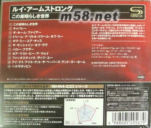 What a Wonderful World世界如此美好(SHM-CD系列日本版)(m58.net) 錄音于1967年 首版音質(zhì)再生可能高音質(zhì)CD SHM-CD音質(zhì)評(píng)價(jià): 音質(zhì)、解像度、音量感、歪感、透明感五大方面均優(yōu)于普通CD, 低頻比XRCD24的表現(xiàn)要好,更加有現(xiàn)場(chǎng)感 SHM-CD與K2HD的比較SHM-CD更加真實(shí)自然,不夸張 SHM-CD在2007年由日本JVC公司研發(fā),與DG、DECCA、PHILIPS等老牌公司合作,至2008年已出版了至少數(shù)十種經(jīng)典產(chǎn)品,大多以古典為主,也有爵士、搖滾。這些經(jīng)典老作品大多首度出版于上世紀(jì)后半葉,首版大多絕跡,而SHM-CD是最能還原首版音質(zhì)的新格式。SHM-CD為日本生產(chǎn)限定盤,雖然收藏價(jià)值極高,可惜發(fā)行不多,數(shù)量有限。