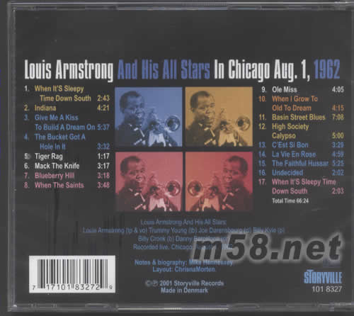 1、WHEN IT’S SLEEPY TIME DOWN SOUTH 2、INDIANA 3、GIVE ME KISS TO BUILD A DREAM ON 4、THE BUCKET GOT A HOLE IN IT 5、TIGER RAG 6、MACK THE KNIFE 7、BLUEBERRY HILL 8、WHEN THE SAINTS 9、OLE MISS 10、WHEN I GROW TO OLD TO DREAM 11、BASIN STREET BLUES 12、HIGH SOCITETY CALYPSO 13、C’EST SI BON 14、LA VIE EN ROSE 15、THE FAITHFUL HUSSAR 16、UNDECIDED 17、WHEN IT’S SLEEPY TIME DOWN SOUTH