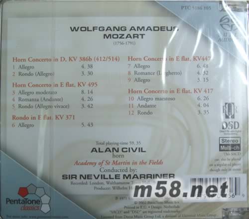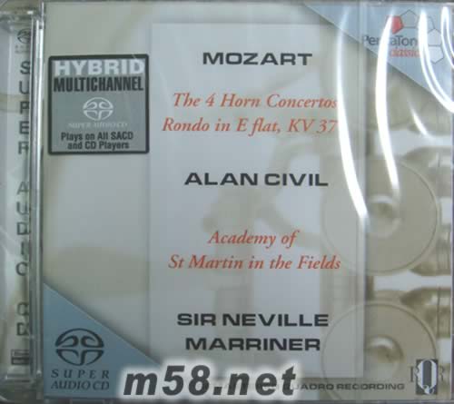 莫扎特:圓號協奏曲 SACD(m58.net) Alan Civil horn 莫扎特:圓號協奏曲》莫扎特共四首圓號協奏曲,分別是D大調一號;降E大調二號;降E大調三號;降E大調四號;這是其銅管樂作品中的不朽名篇,華麗無比,典雅之極!馬里納指揮圣馬丁交響樂團演奏;阿蘭.科維爾圓號演奏;SACD天王音質!