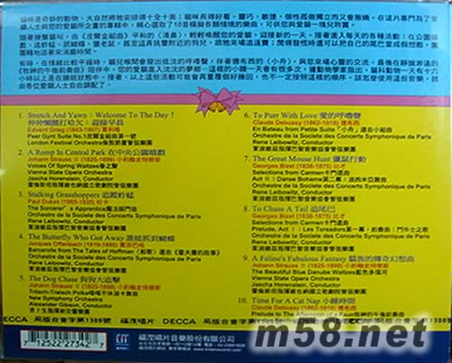 有時,在情緒比較平緩時,貓兒喉間會發出低沈的呼嚕聲,伴著德布西的〈小舟〉,與您來場心靈的交流。最后在靜謐渺遠的《牧神的午后前奏曲》陪伴中,您的愛貓進入沈沈的夢鄉─這樣的小睡一天會有很多次,據動物學家指出,貓科動物一天有十六小時以上是在睡眠狀態中。接著,以上這些活動可能會再重覆個好幾回,也不一定按照這樣的順序,該怎么使用這些音樂,就由各位愛貓人士自由調配了。