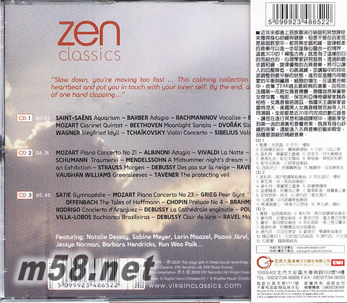 在這套合輯中,收集了EMI過去最經(jīng)典的演奏,由包括法國第一花腔女高音德賽、德國首席單簧管女杰莎賓.梅耶、保加利亞傳奇鋼琴家魏森柏格、女高音雅諾薇茲、俄國天王鋼琴家普雷特涅夫、美國黑人女高音韓翠克絲等人共同演唱,全部都是近20年內(nèi)完成的數(shù)位錄音,讓您在進行冥想和瑜珈課程中,還能享受到第一流的演奏和音響效果,既具有身心舒緩的效果,還能進入古典音樂的藝術(shù)殿堂,品嚐最頂級的精致音樂。