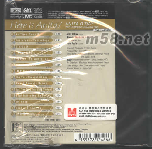 安妮塔·奧黛是一位極為杰出的美國爵士女歌手,正如她自己所說,她的音色乃至于她的整體表演很貼近樂器,而不是貼近人聲。她口腔中經常發出的無意義的音節和她那找不出一個實詞的演唱簡直酷似某些演奏得很另類的樂器,這種唱法在爵士圈里的行話叫“SCAT”,也就是“擬聲”。1976年10月22日,在東京六本目著名的夜總會MINGOS MUSICO,安妮塔舉行了一次相當轟動的演唱會。當時GML公司派出一批經驗豐富、技藝不凡的錄音技術人員,帶上最好的錄音器材,在夜總會演出現場錄下了安妮塔的整場演出。之后不久,GML就出版了這次演出的現場錄音LP,大受歡迎。1987年,GML又出版了同一內容的CD,以24K純金壓片,取名為《安妮塔在此!》,CD編號為GML-30201。1999年,GML把錄音母帶交給JVC進行處理,推出了《安妮塔在此!》的XRCD2版本。此碟時長67分鐘,收錄14首歌曲,其中既有艾靈頓“公爵”(DUKE ELLINGTON)、杰羅姆·科恩(JEROME KERN)這些大師的名作《老于世故的女士》(“SOPHISTICATED LADY”)、《昨天》(“YESTERDAYS”)等,又有安妮塔自己的親筆《安妮塔的藍調》(“ANITA’S BLUES”),曲曲動人,加上當時在美國首屈一指的諾爾曼·西蒙斯(NORMAN SIMMONS)三重奏的精彩伴和,實在是引人入勝。在《我越過水濱》(“I COVER THE WATERFRONT”)一曲中,安妮塔輕吟小唱,運舌發聲有些特別,音色處理得比較釅稠。鮑勃的低音提琴音色真實,它的彈性使空氣有了動感,而諾爾曼的鋼琴音色則顯得明亮而溫潤,厚重沉實——也許,這也是當年模擬錄音的妙處?XRCD2把這個妙處真切地還原出來了。