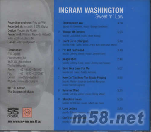 沒有多少個男低音歌手可以唱出比Ingram Washington 英格倫華盛頓 更情感豐富。更沒多少個男聲可比 英格倫華盛頓 般擁有攝人窩心的魅力。愛上 英格倫華盛頓 不僅是他數十載的唱工是那么發揮得淋漓盡致;可收可放。也是STS Digital把他磁性腔音收錄得無比傳神。本專集在STS Digital自設專用錄音室收錄,由STS Digital老板Fritz de with親自操刀,全碟使用近咪收錄法,沒添加Reverb效果和其它輔助器材,這有效防止音源變形。如適當使用這近咪收錄法,可加強回放時之空間感、音效深度和氣氛,歌手和樂器如在當前演出一般。這是 英格倫華盛頓 最愛的11首品,也是STS Digital老板最凸顯其金耳朵功駕之05年最新專輯。