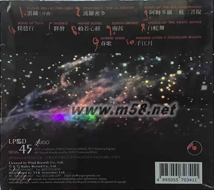 01. 云鐘(序曲) 云間鐘鳴伴透明人聲悠悠乍響,一派云淡風清。 02. 波羅密多 縹緲女聲新世紀空靈唱腔,清美動人心。 03. 阿耨多羅三藐三菩提 [阿姐鼓]朱哲琴友情獨唱,自在而詩意。 04. 琵琶行 八十一人次琵琶震撼演出,千古伎樂天幽然再現。 05. 群僧 喜樂鈴聲伴隨莊嚴清頌,不知天上人間。 06. 般若心經 史上最易背誦吟唱的[心經]創新版即將引爆。 07. 塵鼓 屢次豐富的打擊樂鮮活律動,均衡節奏素描人間。 08. 白蛇舞 現代音樂手法描寫出離與自由,虛無之[空] 09. 春歌 800多人次混聲大合唱,江南小調朗朗上口。 10. 千江月 -音響測試曲 鼓點引出百人禪詩大合唱,氣勢磅礴中乘風而去。