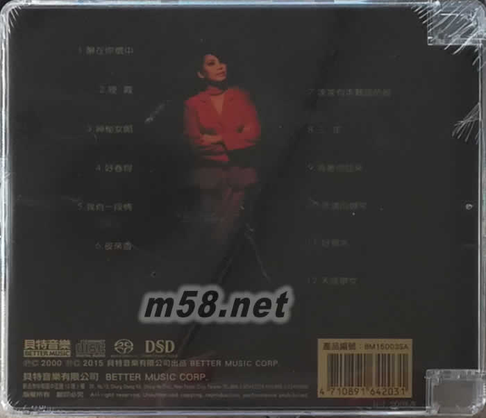 金片子1 天涯歌女 SACD(m58.net) SUPER AUDIO CD Plays on All SACD and CD Players 豐富的細節(jié)、平順自然的高低頻延伸、寬深魔大的音場效果,絕對是SACD典范。聽蔡琴用她迷人的金嗓子詮釋這些老歌,不單聲線變得好了很多,空氣感也多了,弦樂清晰了,錄音效果令人仿如置身之中。24T高品質數(shù)位錄音,真空管收,UNPLUG不插電實力演出。歌壇女伶蔡琴與加拿大、英國、羅馬尼亞、印度、菲律賓和香港頂尖爵士樂手同臺現(xiàn)場演出打造 JAZZ、BLUE、BOSSA、NOVA、LATIN樂風經(jīng)典老歌。
