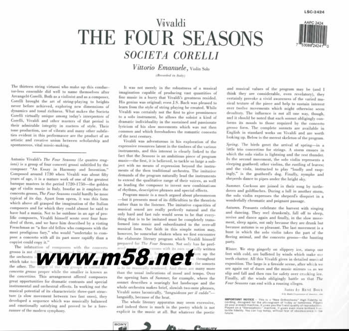 克雷里樂團 維瓦爾弟 四季 Societa Corelli- Vivaldi: The Four Seasons(Living Stereo 立體聲名盤) 黑膠專輯背面圖片