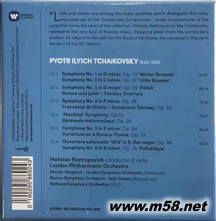CD 1 柴可夫斯基:G小調第一號交響曲《冬之夢》,作品13 柴可夫斯基:C小調第二號交響曲《小俄羅斯》,作品17 CD 2 柴可夫斯基:D大調第三號交響曲《波蘭》,作品29 柴可夫斯基:《羅密歐與茱麗葉》幻想序曲 CD 3 柴可夫斯基:F小調第四號交響曲,作品36 柴可夫斯基:E小調《黎密尼的弗蘭西斯卡》交響幻想曲,作品32 CD 4 柴可夫斯基:降B小調《曼弗萊德》交響曲,作品58 柴可夫斯基:B小調為小提琴與管弦樂團所寫的《憂鬱小夜曲》,作品26 CD 5 柴可夫斯基:E小調第五號交響曲,作品 64 柴可夫斯基:A大調洛可可主題變奏,作品33 CD 6 柴可夫斯基:降E大調慶典序曲《一八一二》,作品49 柴可夫斯基:B小調第六號交響曲《悲愴》,作品74 § 發行資訊 §