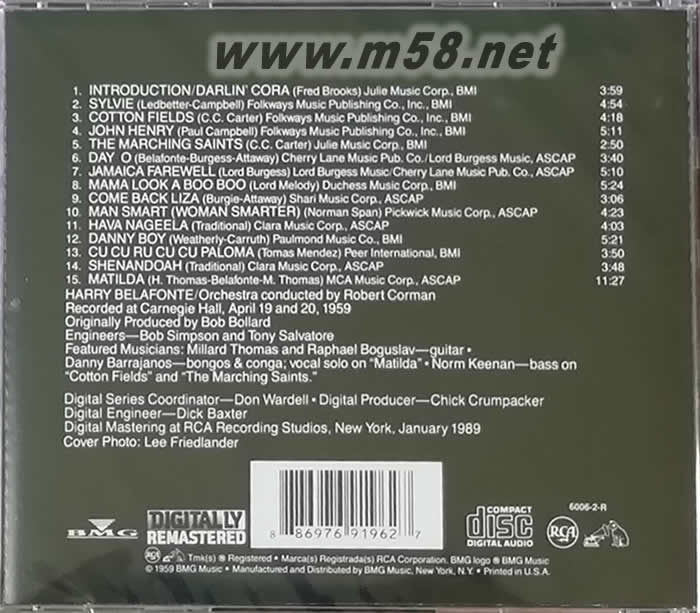 BELAFONTE AT CARNEGIE HALL 貝拉芬堤在卡耐基大廳(m58.net) 在上世紀五、六十年代開始,他是美國流行音樂史上與貓王齊名的偉大黑人歌手,是真正的黑人民族音樂發(fā)揚者,他以摻雜西印度群島加利帕騷(galypso)風格的演唱特色而傾倒眾生。與貓王的英年早逝相對比,BELAFONTE可說是株長青樹,他德高望重,健康長壽。熱心公益事業(yè),本張專輯的絕靚現(xiàn)場演出,就是為做慈善。技佳,德美,傾倒眾生。幾十年來,一直是美國發(fā)燒界的模子。 他的嗓音中氣十足,嘹亮渾厚,肺活量大得驚人,嘖嘖,就憑這樣的底氣,不服不行。他既擅長古典,也擅長爵士,絕對發(fā)燒的一把好嗓!值得收藏!