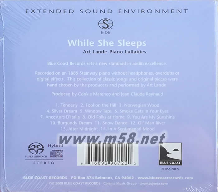 藍岸唱片 2 WHILE SHE SLEEPS SACD(紫色封面)(m58.net) While She Sleeps Blue Coast Records 藍岸唱片,Extended Sound Environment (E.S.E.) 技術錄製,無任何電子音效添加,現場感十足,由按琴鍵至踏腳板等細緻聲音均出現在眼前。Art Lande 使用1885 Steinway鋼琴,Jean Claude Reynaud (即音響品牌JMR, Jean Marie Reynaud 之子)把Art Lande與Steinway 的美麗聲音完完全全收錄在2 吋analog磁帶上,帶出真實之音樂感覺。Art Lande 曾經參與數十張專輯,以ECM及 Windham Hill商標名義出版之作品更超越十張,這專輯是他20年來首次推出之個人作品,是一張發燒純鋼琴專輯,挑選曲目包括有The Beatles、Stephen Foster、Duke Ellington及Art Lande自己作品共14首,正如藍岸唱片口號Blue Coast Records sets a new standard in audio excellence “完美音效新規范”,1 Hybrid SACD + 1 Upcoming Song CD亞洲區獨有,限量發售。