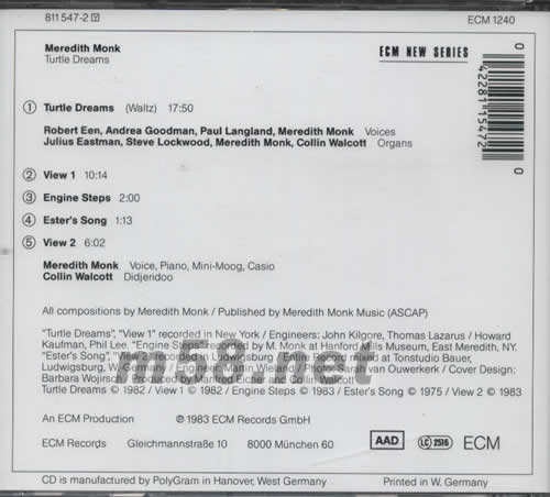 1.TURTLE DREAMS ROBERT EEN,ANDREA GOODMAN,PAUL LANGLAND,MEREDITH MONK JULIUS EASTMAN,STEVE LOCKWOOD,MEREDITH MONK,COLLIN WALCOTT 2.VIEW 1 3.ENGINE STEPS 4.ESTER'S SONG 5.VIEW 2 MEREDITH MONK COLLIN WALCOTT