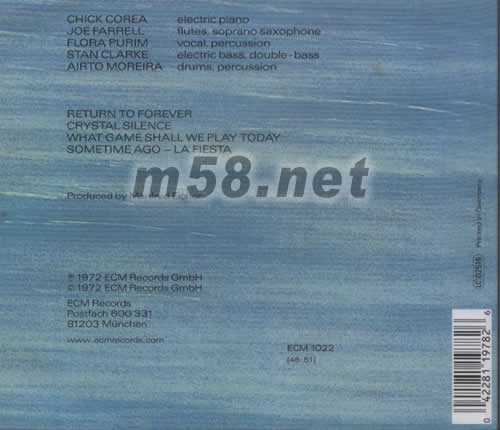 RETURN TO FOREVER(m58.net) 此專輯被公認為爵士樂史上,最具影響力及最受歡迎的專輯之一. Chick Corea三十年的音樂生涯是不同音樂經歷的一種混合。1941年,他出生于美國馬薩諸薩州 1971年,在“Circle”成立三年之后,Corea改變了其音樂上的注意力。成立了早期版本的Return to Forever,樂隊的風格很柔和、充滿桑巴風味,這時Stanley Clark任貝司手,還有人聲樂手Flora Purim,其丈夫Airto為鼓手,長笛手Joe Farrell。以這個班底制作了兩張專輯和一部分獨奏鋼琴專輯以后,Chick Corea開始為樂隊插上了電,走上Fusion的路線,這時還招募了兩位充滿火力的樂手鼓手Lenny White和吉他手Bill Connors。