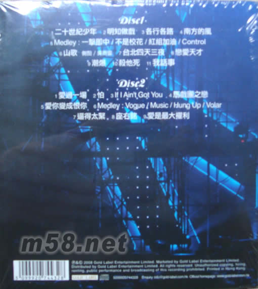 Disc 1 01. 二十世紀(jì)少年 02. 明知做戲 03. 各行各路 04. 南方的風(fēng) 05. Medley:一擊即中/不是校花/紅組加油/Control 06. 山歌 -側(cè)田/吳雨霏 07. 臺北四天三夜 08. 戀愛天才 09. 潮爆 10. 殺他死 11. 我話事 Disc 2 01. 愛過一場 02. 怕 03. If I Ain't Got You 04. 馬戲團(tuán)之戀 05. 愛你變成恨你 06. Medley:Vogue/Music/Hung Up/Volar 07. 逼得太緊 08. 座右銘 09. 愛是最大權(quán)利