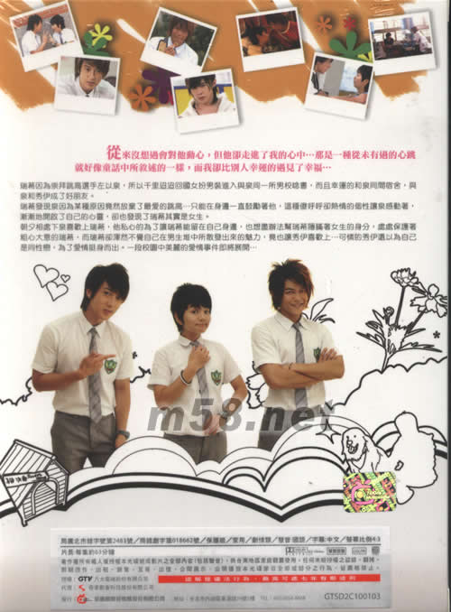 *每個小女孩在成長的過程中都會歷經暗戀的過程,面對心儀的男生,臉紅、怦然心動的感覺是少女時期最甜蜜的記憶,本片將這初戀酸甜的滋味透過偶像劇的演出勾起觀眾甜美的記憶。 【劇情簡介】 從來沒想過會對他動心,但他卻走進了我的心中… 那是一種從未有過的心跳,就好象童話敘述的一樣, 而我卻比別人幸運地遇見了幸福… 瑞莃因為崇拜跳高選手左以泉,所以千里迢迢回國女扮男裝進入與泉同一所男校念書,而且幸運的和泉同間宿舍,與泉和秀伊成了好朋友。 瑞莃發現泉因為某種原因竟然放棄了最愛的跳高…只能在身邊一直鼓勵著他,這種傻呼呼卻熱情的個性讓泉感動著,漸漸地開啟了自己的心靈,卻也發現了瑞莃其實是女生。 除了泉外就只有校醫梅田發現了瑞莃是女兒身,他負責每天開導著瑞莃訴說對泉的愛情煩惱,而此時第三宿舍也由思南帶領著大家向前沖,梅田洞悉著宿舍間充滿逗趣的良性競爭,一段校園中美麗的愛情事件即將展開…… 集 數:11-15,共5集(全劇15集) 片 數:共 2 片 級 別:輔導級 規 格:D9 x 1 + D5 x 1 片 長:每集約65分鐘 發 音:國語 字 幕:繁體中文 螢 幕 比:4:3 音 效:AC3 2.0 Ch 特別說明:每集均附幕后直擊一則