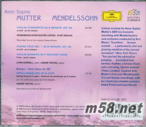 Felix Mendelssohn (1809 - 1847) Violin Concerto in E minor, Op.64 [1] 1. Allegro molto appassionato [12:19] [2] 2. Andante [7:15] [3] 3. Allegretto non troppo - Allegro molto vivace [6:15] Anne-Sophie Mutter, Gewandhausorchester Leipzig, Kurt Masur Piano Trio No.1 in D minor, Op.49 [4] 1. Molto allegro agitato [9:01] [5] 2. Andante con moto tranquillo [6:52] [6] 3. Scherzo (Leggiero e vivace) [3:38] [7] 4. Finale (Allegro assai appassionato) [8:10] Anne-Sophie Mutter, Lynn Harrell, André Previn Sonata for Violin and Piano in F major (1838) (without opus number) [8] 1. Allegro vivace [11:25] [9] 2. Adagio [7:14] [10] 3. Assai vivace [5:23] Lieder ohne Worte, Op.62 (Arr. Fritz Kreisler) [11] 6. Frühlingslied [2:18] Anne-Sophie Mutter, André Previn
