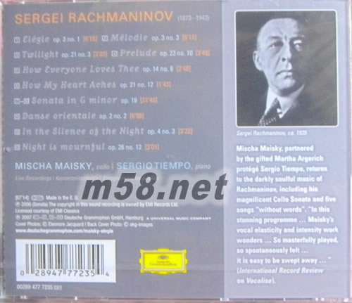 梅斯查·麥斯基(Mischa Maisky)是一位杰出的音樂(lè)家,他把拉赫瑪尼諾夫(Rachmaninoff)鋼琴和聲樂(lè)作品中旋律最動(dòng)聽(tīng)的部分作品,改編成大提琴與鋼琴獨(dú)奏曲,如傾如訴的大提琴醇綿悠長(zhǎng)的弦音與深沉寬廣的鋼琴伴奏在醉人的音樂(lè)中對(duì)話、交流、對(duì)應(yīng)、交替,和著年青鋼琴家塞吉奧·蒂耶普(Sergio Tiempo)大氣流暢的琴音,讓音樂(lè)散發(fā)出一種高貴、卓爾不群的優(yōu)雅氣質(zhì),感人至深