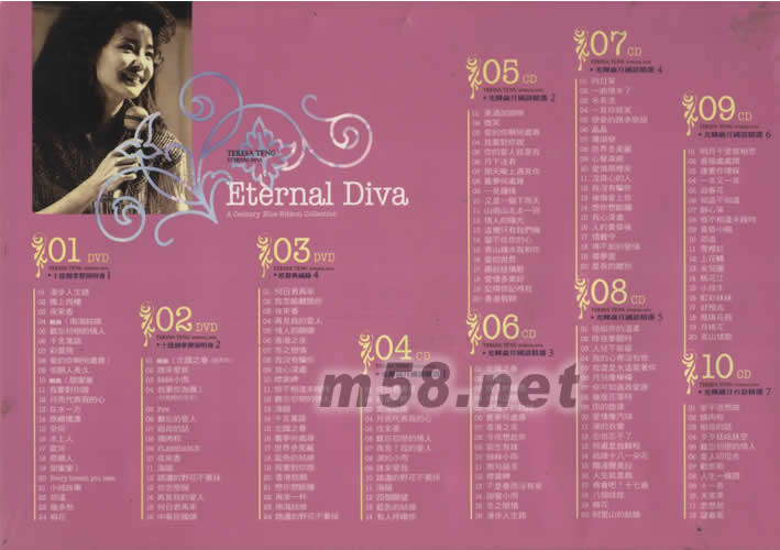 01 DVD 十億個掌聲演唱會1 01. 漫步人生路 02. 獨上西樓 03. 夜來香 組曲 (04. 南海姑娘 05. 難忘初戀的情人 06. 千言萬語 07. 彩云飛 08. 愛的你啊何處尋) 09. 但愿人長久 組曲 10. 甜蜜蜜 11. 我要對你說 12. 月亮代表我的心 13. 在水一方 14. 原鄉情濃 15. 奈何 16. 水上人 17. 云河 18. 原鄉人 19. 甜蜜蜜) 20. EVERY BREATH YOU TAKE 21. 小城故事 22. 郊道 23. 幾多愁 24. 梅花 02 DVD 十億個掌聲演唱會2 01. 組曲:北國之春(我和你) 02. 誰來愛我 03. 絲絲小雨 04. 我要你為偶(你我相伴左右) 05. FIRE 06. 難忘的愛人 07. 祖母的話 08. 燒肉粽 09. FLASH DANCE 10. 夜來香 11. 海韻 12. 路邊的野花不要采 13. 你怎么說 14. 再見我的愛人 15. 何日君再來 16. ***** 03 DVD 原聲典藏錄4 01. 何日君再來 02. 我怎能離開你 03. 夜來香 04. 再見我的愛人 05. 情人的關懷 06. 香港之夜 07. 冬之戀情 08. 我沒有騙你 09. 我心深處 10. 襟裳岬 11. 恨不相逢未嫁時 12. 難忘初戀的情人 13. 海韻 14. 千言萬語 15. 北國之春 16. 舊夢何處尋 17. 世界多美麗 18. 藍色的姑娘 19. 我要對你說 20. 香港假期 21. 想你想斷腸 22. 再來一杯 23. 南海姑娘 24. 路邊的野花不要采 04 CD 光輝歲月國語精選1 01. 何日君再來 02. 再來一杯 03. 南海姑娘 04. 月亮代表我的心 05. 夜來香 06. 難忘初戀的情人 07. 再見!我的愛人 08. 淚的小雨 09. 誰來愛我 10. 路邊的野花不要采 11. 海韻 12. 四個愿望 13. 藍色的姑娘 14. 有人呼喚你 05 CD 光輝歲月國語精選2 01. 美酒加咖啡 02. 微笑 03. 愛的你啊何處尋 04. 我要對你說 05. 你的愛人就是我 06. 月下送君 07. 那天晚上遇見你 08. 舊夢何處尋 09. 一見鐘情 10. 又是一個下雨天 11. 山南山北走一回 12. 情人的陽光 13. 這里只有我們倆 14. 留不住你的心 15. 青山綠水我和你 16. 愛的世界 17. 娜奴娃情歌 18. 愛情多美好 19. 記得你記得我 20. 香港假期 06 CD 光輝歲月國語精選3 01. 北國之春 02. 問自己 03. 情人的關懷 04. 小村之戀 05. 夜霧下的姑娘 06. 舊夢何處尋 07. 香港之夜 08. 今夜想起你 09. 前生有緣 10. 絲絲小雨 11. 那句諾言 12. 襟裳岬 13. 不是春雨沒有來 14. 甜蜜小雨 15. 冬之戀情 16. 漫步人生路 07 CD 光輝歲月國語精選4 01. 向日葵 02. 一曲情未了 03. 水長流 04. 一見你就笑 05. 戀愛的路多么甜 06. 晶晶 07. 珊瑚戀 08. 世界多美麗 09. 心聲淚痕 10. 愛情那里來 11. 沒良心的人 12. 我沒有騙你 13. 后悔愛上你 14. 想你想斷腸 15. 我心深處 16. 人約黃昏后 17. 情難守 18. 得不到的愛情 19. 尋夢園 20. 星夜的離別 08 CD 光輝歲月國語精選5 01. 恰似你的溫柔 02. 昨夜夢醒時 03. 人兒不能留 04. 我的心里沒有他 05. 我還是永遠愛著你 06. 月兒像檸檬 07. 你可知道我愛誰 08. 幾度花落時 09. 雨的旋律 10. 愛情像汽球 11. 淚的衣裳 12. 忘也忘不了 13. 何處是我歸程 14. 姑娘十八一朵花 15. 關達娜美拉 16. 人生就是戲 17. 再會吧!十七歲 18. 八個娃娃 19. 梅花 20. 阿里山的姑娘 09 CD 光輝歲月國語精選6 01. 明月千里寄相思 02. 薔薇處處開 03. 誰要你理睬 04. 一年又一年 05. 迎春花 06. 知道不知道 07. 靜心等 08. 恨不相逢未嫁時 09. 黃昏小唱 10. 郊道 11. 雪里紅 12. 上花轎 13. 女兒圈 14. 桃花江 15. 小放牛 16. 虹彩妹妹 17. 好預兆 18. 鳳陽花鼓 19. 月桃花 20. 茶山情歌 10 CD 光輝歲月國語精選7 01. 安平追想曲 02. 燒肉粽 03. 祖母的話 04. 歹歹尫吃抹空 05. 難忘初戀的情人 06. 愛人叨位去 07. 勸世歌 08. 人生一條路 09. 十一哥 10. 天黑黑 11. 思想起 12. 望春風