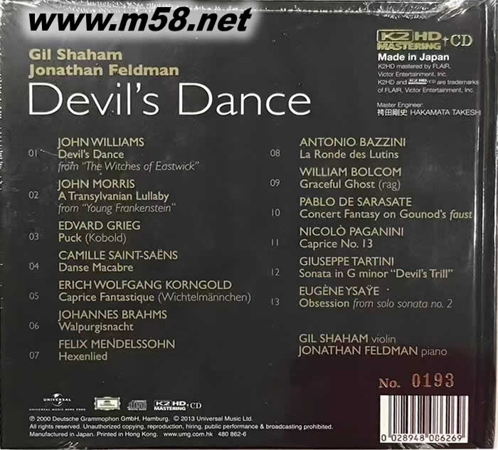 Devil’s Dance 魔鬼之舞 限量版 K2HD(m58.net) 《魔鬼之舞》(Devil's Dance)是當今世界著名的年輕一代小提琴演奏大師吉爾?沙漢姆(Gil Shaham)演奏的小提琴作品。這些作品由勃拉姆斯、帕格尼尼、薩拉薩蒂等創作,具有相當高的演奏難度,充分展現了大師高超的技巧。同時,唱片的錄音極其發燒。“為小提琴家的樂趣之一就是去演奏魔鬼似的、有感發力的、有魔力的、幽靈般的音樂。感謝全體德國唱片公司的成員,他們看起來和我一樣喜愛這個主題。我尤其想要感謝喬納森?菲德曼和約翰?威廉姆斯,他們給這個選集貢獻了兩首出色的改編曲。”——吉爾?沙漢姆 集結“魔鬼題材”小提琴作品,演奏更加“魔鬼附身”般出神入化,發燒級錄音平添驚心動魄之超凡效果,這個廣受好評的版本被視為古典音樂流行化的又一典范。只需聽聽唱片開頭那幾聲振聾發聵的撥弦便能令你興奮不已。收錄的13首曲目中,不僅有許多曲目原本就需要高超的技巧,更有不少曲目因為他人改編,更顯得花俏而艱難,例如著名的《魔鬼的顫音》,吉爾?沙漢姆選擇的不是塔蒂尼的原版,而是克萊斯勒的改編版;帕格尼尼《隨想曲》第十三段也由舒曼改編而成為與鋼琴合奏版;圣桑的《骷髏之舞》也由他本人改編為小提琴與鋼琴合奏版等等。這些曲子,可謂音音皆辛苦,不難聽得到吉爾?沙漢姆為了克服這些難曲,所做的努力與用心。為他伴奏的鋼琴家Feldman. Jonathan 同俱超技本領,盡顯魔鬼般的技藝,有令人著迷的功力。