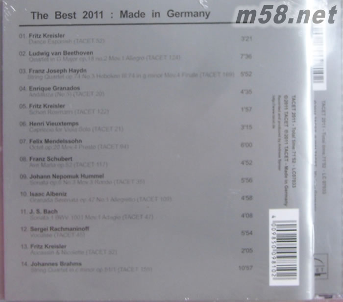01. 法雅(克萊斯勒改編)《西班牙舞曲》 二十世最偉大的小提琴家克萊斯勒改編法雅《西班牙舞曲》,美好動聽的旋律尤其受到小提琴獨奏家與觀眾喜愛。 02. 貝多芬《G大調(diào)弦樂四重奏,作品18-2》第二樂章快板 以罕見的頂級真空管設(shè)備錄製,榮獲音響專業(yè)雜誌Stereoplay滿分大賞。 03. 海頓《g小調(diào)弦樂四重奏,作品74-3》第四樂章終曲 海頓所創(chuàng)作弦樂四重奏精采之作,由於終樂章有著輕快的騎馬節(jié)奏,因此並被海頓附上「騎士」標(biāo)題,而聞名樂壇。 04. 葛拉納多斯《祈禱》 《十二首西班牙舞曲集》之一,木質(zhì)琴板共鳴聲中的清脆細(xì)致,散發(fā)出來的溫暖音色、以及空氣振動所表現(xiàn)出來的空間層次感,皆達(dá)到示范級數(shù)。 05. 克萊斯勒《美麗的蘿絲瑪琳》 克萊斯勒三首維也納風(fēng)格圓舞曲之一,提琴家最喜愛演奏的曲目之一,也被改編成各種不同形式的器樂獨奏曲和合奏曲。 06. 魏奧當(dāng)《無伴奏中提琴隨想曲》 法比學(xué)派的演奏與創(chuàng)作大師名曲之一,使用Neumann與Schoeps真空管麥克風(fēng),呈現(xiàn)出中提琴豐富的厚度與真實形體,與迴盪在空氣中的那份溫暖琴音。 07. 孟德爾頌《八重奏,作品20》第四樂章急板 孟德爾頌於16歲所做的天才之作,精致的錄音效果,清楚地捕捉了弦樂濃郁縝密的音色質(zhì)感。 08. 舒伯特《圣母頌,作品52》 於28歲專為女高音獨唱而作,使用真空管設(shè)備錄製,呈現(xiàn)出自然真實、靚絕通透的細(xì)致音色。 09. 胡麥爾《奏鳴曲,作品5-3》第三樂章輪旋曲 莫札特門下首徒,抒情優(yōu)雅的音樂語匯,日后影響鋼琴詩人蕭邦風(fēng)格甚鉅。 10. 阿爾班尼士《格拉納達(dá)小夜曲,作品47-1》稍快板 「摯愛吉他二重奏」創(chuàng)新細(xì)膩的彈奏技法,豐富的堂音表現(xiàn),一顆顆的吉他音符,就好像是被從音箱里彈出到空氣中一樣,令人印象深刻。 11. 巴哈《第一號無伴奏小提琴奏鳴曲,BWV1001》第一樂章慢板 被認(rèn)為是「小提琴家的試金石」,佛羅林‧保羅拉奏1701年珍貴的Vincenzo Ruggieri琴,用理性內(nèi)斂的手法,忠實呈現(xiàn)巴哈音樂中的哲思。 12. 拉赫曼尼諾夫《練聲曲》 於1912年完成之第14首《練聲曲》,合上TACET的頂級真空管錄音,呈現(xiàn)出的絕佳空氣感與樂器實體感。 13. 克萊斯勒《奧卡辛與妮可蕾特》 小提琴家丹尼爾‧蓋德透過1709年史特拉第瓦里與瓜納里兩把義大利名琴錄音,加上Tacet以1949年Neumann M49真空管麥克風(fēng)收錄加持,逼真呈現(xiàn)義大利的小提琴榮光。 14. 布拉姆斯《c小調(diào)弦樂四重奏,作品51-1》第一樂章快板 大師畢生三首弦樂四重奏之一,帶有獨特的精細(xì)對位與厚重醇厚和聲,錄音展現(xiàn)了古董真空管麥克風(fēng)音色甜蜜無比的威力,堪稱弦樂四重奏發(fā)燒錄音典范。