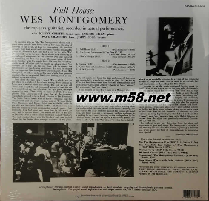 滿座 在加州伯克利TSUBO酒店的吉它演奏會(huì) FULL HOUSE RECORDED LIVE AT TSDUBO BERKELEY CALIFORNIA 黑膠(m58.net) Wes Montgomery,著名爵士吉它演奏家。對(duì)爵士的精神有著深刻的理解,通過(guò)強(qiáng)有力的平行八度的彈奏法,他將爵士吉他彈奏帶入了一個(gè)新的高度,也成為了爵士吉他素材中很重要的一部分。Wes的撥弦方法也是獨(dú)一無(wú)二----全部使用大拇指撥弦,據(jù)說(shuō)他是為了在練琴的時(shí)候能夠彈奏得安靜些不吵醒自己的孩子,后來(lái)發(fā)現(xiàn)這樣撥弦的音色很不錯(cuò),就一直使用了下去。