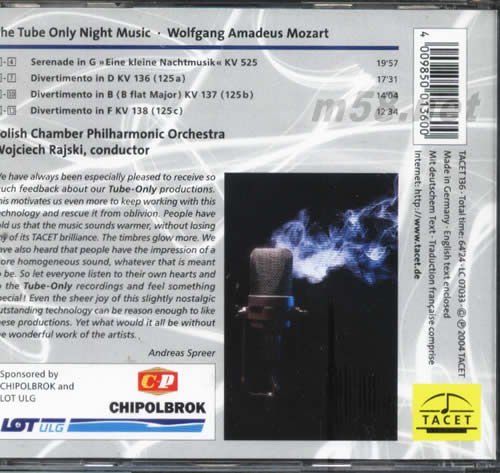 G大調(diào)弦樂小夜曲KV525是莫扎特為了節(jié)慶所編寫的眾多小夜曲中最為動聽的一首曲子,本片由拉斯基指揮『波蘭室內(nèi)愛樂管弦樂團』,全程以價值連城、珍貴稀有的電容式古董《真空管麥克風(fēng)》來收錄,令一般利用晶體放大組件來處理音源信號的唱片相形失色許多。精準(zhǔn)的麥克風(fēng)擺位,比起高科技的數(shù)字錄音有過之而無不及,油亮富有光澤的優(yōu)美音色,簡直就像是用手觸摸高級綢緞般地舒適,溫暖直入心坎的韻律,完全讓您聽不到刺耳尖銳的高頻,以及模糊逆耳的低頻。