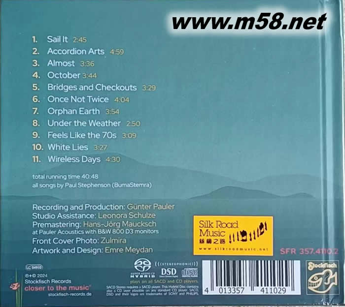 無拘無束的時光 Wireless Days SACD(m58.net) Paul Stephenson (主唱及結他) Jens Kommnick (結他) Ian Melrose (結他) Lea Morris (和唱) Justin Ciuche (中提琴) Manfred Leuchter (手風琴及“哈蒙德”; 電風琴b3) Beo Brockhausen (薩克斯管、 敲擊、手風琴、合成器鍵盤及和弦齊特琴) Lars Hansen (電低音結他) 1. 著名唱作詩人保羅‧斯蒂芬森(Paul Stephenson)曾與錄音界巨擘“老虎魚(Stockfisch)”數度合作,他那獨特的風格與如泉水般清澈、優雅中帶著暖意的絕美聲線,創作的歌詞清新脫俗,配合他超凡的結他技術,自彈自唱時彷如置身于一片綠悠悠的大草原般憩靜放鬆,贏得歌迷好評如潮,被視為“發燒男聲”翹材份子之一。
