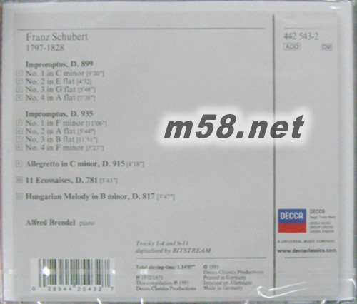 Franz Schubert (1797 - 1828) 4 Impromptus, Op.90, D.899 [1] No.1 in C minor: Allegro molto moderato [9:25] [2] No.2 in E flat: Allegro [4:35] [3] No.3 in G flat: Andante [5:51] [4] No.4 in A flat: Allegretto [7:43] 4 Impromptus Op.142, D.935 [5] No.1 in F minor: Allegro moderato [11:14] [6] No.2 in A flat: Allegretto [5:48] [7] No.3 in B flat: Theme (Andante) with Variations [11:54] [8] No.4 in F minor: Allegro scherzando [5:31] [9] Allegretto in C minor, D.915 [4:28] [10] 11 Ecossaises, D.781 [3:46] [11] Hungarian Melody in B minor, D.817 [3:57]