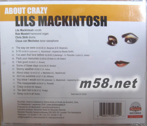 價(jià)格為估,以實(shí)到貨為準(zhǔn)! About Crazy(m58.net) Lils Mackintosh是荷蘭最著名的爵士女歌手,出道超過(guò)廿件,灌錄唱碟10多張,演唱經(jīng)非常豐富,在當(dāng)年無(wú)人不識(shí),自1993年出版的(It’s not perfect to be easy)專(zhuān)輯后,立刻轟動(dòng)荷蘭爵士音樂(lè)界,更被讚譽(yù)為是「歐洲的 Billie Holiday」。1999年,她出版了一張獻(xiàn)給美國(guó)傳奇藍(lán)調(diào)結(jié)他歌手Huddie Ledbetter的專(zhuān)輯(Black Girl),藉此贏(yíng)得2000年荷蘭一年一度最重要的「荷蘭愛(ài)迪生爵士樂(lè)大獎(jiǎng)」。 發(fā)燒友最熟悉Lils Mackintosh的專(zhuān)輯,必定是2002年她於發(fā)燒名廠(chǎng)STS Digital旗下出版的ln The Wee Small Hours of the Morning SACD,即是綠色封面右邊有Kharma極品級(jí)揚(yáng)器的一張碟,也是STS Digital廠(chǎng)牌早期出版的Essence of Music系列發(fā)燒大碟,碟內(nèi)收錄的一首Summertime的 Lils渾厚沙啞嗓音,充滿(mǎn)濃郁迷人韻味,與樂(lè)聲清晰自然效果的極致優(yōu)越Hi End聽(tīng)感,匹配吸引得無(wú)可置疑,還有一張 Beets Brothers Live in Holland亦有Lils Mackintosh作嘉賓,演唱數(shù)首高歌曲,其精彩出色歌藝今人至今難忘。 事實(shí)上,Lils Mackintosh的歌聲除了像Billie Holiday之外,她的歌藝特別出色,歌腔韻味醉人,感情自然,魅力強(qiáng)盛。多年以來(lái),她都有自己的樂(lè)隊(duì)班底,跟她到處演出,每到演唱之處俱座無(wú)虛席,近年來(lái),她更拍電影、演歌劇甚至開(kāi)班授徒教唱歌,廣泛受歡迎。 About Crazy是Lils Mackintosh最新出版的動(dòng)人爵士樂(lè)錄音,音樂(lè)部分由3位老拍擋負(fù)責(zé),他們分別是Rob Mosten彈organ、Clous van Mechelen吹色士風(fēng)及Chris Strik打鼓。全碟以第14首經(jīng)典著名金曲,大部分的旋律都熟悉,新編音樂(lè)風(fēng)格揉合了爵士樂(lè)、藍(lán)調(diào)以及一些搖滾樂(lè)持色,充滿(mǎn)激情動(dòng)人元素,Lils的演繹水準(zhǔn)極之高,奔放自然動(dòng)人,當(dāng)中包括The Way We Were、Stormy Weather、Ain’t No Sunshine、Some Of These Days、You Know I Would、This Masquerade以及Crazy等等,全都吸引至極,加上細(xì)緻鮮明的發(fā)燒錄音和製作,更加值得女聲發(fā)燒友欣賞。