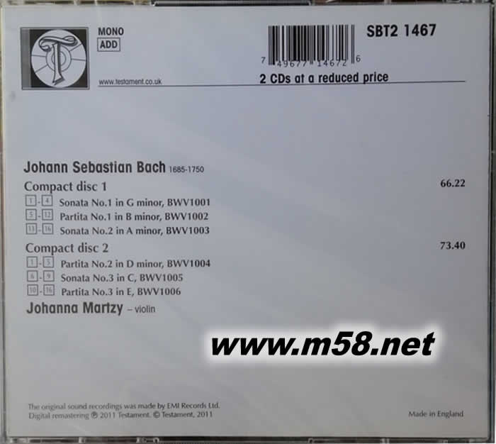 Bach: Sonatas & Partitas 巴赫: 6首無伴奏小提琴奏鳴曲(BWV1001~1006) 小提琴協(xié)奏曲 雙碟(m58.net) 輯錄自早逝天才瑪茨3張六○年代珍貴名版LP 與西格第(Szigeti)師出同門, 堪位列匈牙利小提琴學(xué)派代表人物 英國原裝進口; EMI原廠音源精心轉(zhuǎn)製