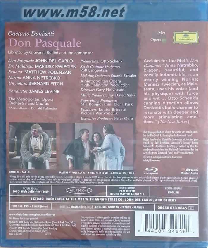 《唐尼采蒂:唐•巴斯瓜雷》由名歌劇指揮家詹姆斯•李汶帶領大都會歌劇院管弦樂團演奏,并由著名女高音安娜•聶翠波科的傾情演唱。