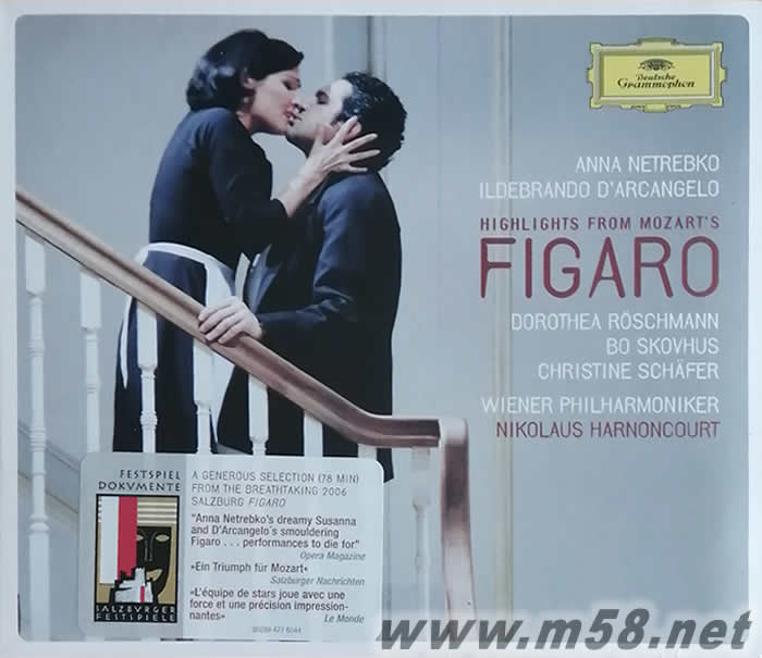 歌劇 費加洛的婚禮 選粹MOZART FIGARO 莫扎特(m58.net) 這套《莫扎特:費加羅的婚禮(精華)》由DG唱片公司發行于2007年,尼克拉斯•哈農庫特指揮維也納愛樂樂團演奏錄制。 莫扎特的創作手法新穎,旋律純樸優美,織體干凈細致,配器注重音色效果,發揮了復調音樂的積極作用,對后世音樂創作產生極大的影響。他在短促的一生中共創作了75部作品,留下了《費加羅的婚禮》、《唐璜》、《后宮誘逃》、《魔笛》等著名歌劇,使歌劇成為具有市民特點的新體裁。并作有大量交響曲、協奏曲、鋼琴曲和室內樂重奏。 莫扎特早期的創作主要是意大利風格,而他在歌劇創作領域中的最高成就,是在他一生中的最后十年達到的,主要作品有:兩部德國歌唱劇—《后宮誘逃》和《魔笛》,采用德文劇詞;一部意大利喜歌劇《費加羅的婚禮》,采用意大利文歌詞,但以奧地利民族文化傳統為基礎;還有一部新型歌劇 《唐璜》, 這部歌劇將音樂悲劇和喜劇的最重要特點熔為一爐。 莫扎特作于1785-1786年間的四幕喜歌劇《費加羅的婚禮》描寫了作為平民的費加羅,同垂涎于他未婚妻蘇珊娜的美貌的貴族主人之間的斗爭,最后以他的機敏幽默而取得勝利。這部社會性喜劇在大革命前夕的法國,對封建貴族的揭露和諷刺起了很大的作用。莫扎特在創作這部歌劇時保留了原作的基本思想,那愚蠢而又放蕩的貴族老爺同獲得勝利的聰明仆人形成鮮明的對照,并以此作為整個劇情發展和音樂描寫的基礎。 《費加羅的婚禮》序曲采用交響樂的手法,言簡意賅地體現了這部喜劇所特有的輕松而無節制的歡樂,以及進展神速的節奏,這段充滿生活動力而且效果輝煌的音樂本身,具有相當完整而獨立的特點,因此它可以脫離歌劇而單獨演奏,成為音樂會上深受歡迎的傳統曲目之一。序曲雖然并沒有從歌劇的音樂主題直接取材,但是同歌劇本身有深刻的聯系,是用奏鳴曲形式寫成的。 這個演出版本的主要演員安娜•聶翠波科(Anna Netrebko),是當紅于世界歌劇界的女高音歌手。她不僅具有華麗的嗓音,扎實的歌唱基本功,而她的美貌更是為人所稱道。 安娜•聶翠波科出生于俄羅斯西南部的克拉斯諾達爾市,后入讀圣彼得堡音樂學院。求學時期曾在圣彼得堡馬林斯基劇院兼職洗地板的女工。不過后來她在劇院求職面試時,被劇院的藝術總監瓦列里•格吉耶夫認出。格氏相當欣賞其嗓音,自此成為她的聲樂入門導師。而在1994年,聶翠波科得到首次歌劇演出機會,就是于在格吉耶夫指揮下的馬林斯基劇院出演《費加羅的婚禮》中的蘇姍娜。而聶翠波科還在馬林斯基劇院擔任過《夢游女》、《魔笛》、《拉美摩爾的露契亞》和《塞維利亞的理發師》當中的女主角。聶翠波科在1995年首次在美國登臺,在舊金山歌劇院飾演《魯斯蘭與柳德米拉》中的柳德米拉一角。此后她開始在美國各地的巡回演出,并因對角色準確的理解和藝術形象的塑造而成為俄語歌劇最有力的代言人。她在《戰爭與和平》、《沙皇的新娘》和《情定修道院》等俄語歌劇的演出,更被奉為經典。而聶翠波科的美聲技巧也毫不遜色。她在《弄臣》,普契尼的《波希米亞人》和《卡普烈特與蒙太奇》中出演的美聲角色也是為人津津樂道。 聶翠波科被譽為當今俄羅斯聲樂學派正宗傳人。她的嗓音兼具渾厚清亮、華麗圓潤,因此她既可作為抒情女高音,也可出演莊重女高音的角色,而她的花腔唱段的生命力和穿透力更是一絕。而音域方面,她能毫不費力地唱到降E6甚至E6的高音。聶翠波科對角色準確的理解和藝術形象的塑造尤為人所折服,兼具渾厚清亮、華麗圓潤的嗓音,即使在演唱難度頗大的著名唱段毫不費力,聲音華麗,高音部分花腔流暢自然,穿透力強,富有生命力。