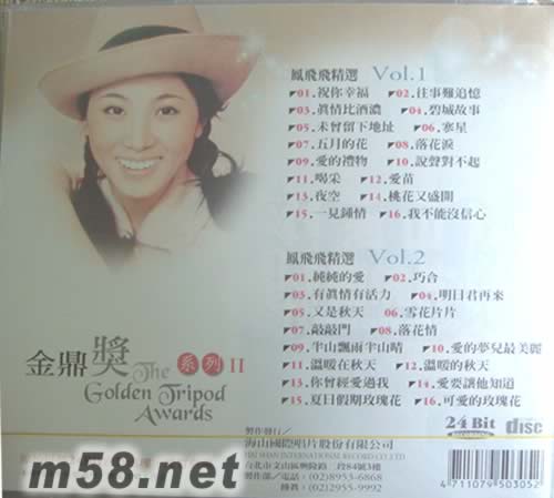 鳳飛飛精選 Vol.1 01. 祝你幸福 02. 往事難追憶 03. 真情比酒濃 04. 碧城故事 05. 未曾留下地址 06. 寒星 07. 五月的花 08. 落花淚 09. 愛的禮物 10. 說聲對不起 11. 喝彩 12. 愛苗 13. 夜空 14. 桃花又盛開 15. 一見鐘情 16. 我不能沒信心 鳳飛飛精選 Vol.2 01. 純純的愛 02. 巧合 03. 有真情有活力 04. 明日君再來 05. 又是秋天 06. 雪花片片 07. 敲敲門 08. 落花情 09. 半山飄雨半山晴 10. 愛的夢兒最美麗 11. 溫暖在秋天 12. 溫暖的秋天 13. 你曾經愛過我 14. 愛要讓他知道 15. 夏日假期玫瑰花 16. 可愛的玫瑰花