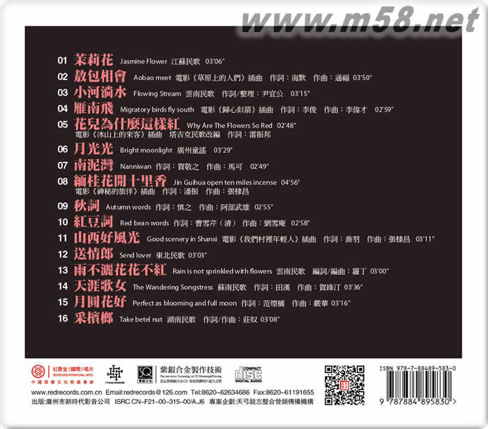 01 茉莉花 Jasmine Flower 03’06” 江蘇民歌 02 敖包相會 Aobao meet 03’50” 電影《草原上的人們》插曲 作詞:海默 作曲:通福 03 小河淌水 Flowing Stream 03’15” 云南民歌 作詞/整理:尹宜公 04 雁南飛 Migratory birds fly south 02’59” 電影《歸心似箭》插曲 作詞:李俊 作曲:李偉才 05 花兒為什么這樣紅 Why Are The Flowers So Red 02’48” 電影《冰山上的來客》插曲 塔吉克民歌改編 作詞:雷振邦 06 月光光 Bright moonlight 03’29” 廣州童謠 07 南泥灣 Nanniwan 02’49” 作詞:賀敬之 作曲:馬可 08 緬桂花開十里香 Jin Guihua open ten miles incense 04’56” 電影《神秘的旅伴》插曲 作詞:潘振 作曲:張棣昌 09 秋詞 Autumn words 02’55” 作詞:慎之 作曲:阿部武雄 10 紅豆詞 Red bean words 02’58” 作詞:曹雪芹(清) 作曲:劉雪庵 11 山西好風光 Good scenery in Shanxi 03’11” 電影《我們村里年輕人》插曲 作詞:喬羽 作曲:張棣昌 12 送情郎 Send lover 03’03” 東北民歌 13 雨不灑花花不紅 Rain is not sprinkled with flowers 03’00” 云南民歌 編詞/編曲:羅丁 14 天涯歌女 The Wandering Songstress 03’36” 蘇南民歌 作詞:田漢 作曲:賀綠汀 15 月圓花好 Perfect as blooming and full moon 03’16” 作詞:范煙橋 作曲:嚴華 16 采檳榔 Take betel nut 03’08” 湖南民歌 作詞/作曲:莊奴