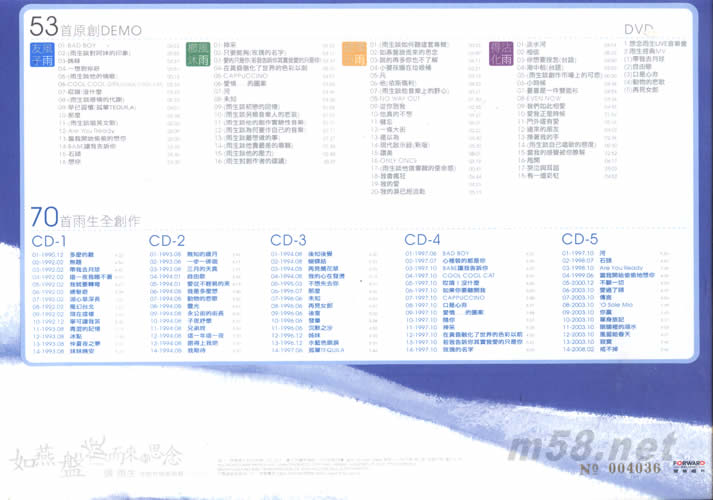 53首原創(chuàng)DEMO CD 1 01. BAD BOY 02. (雨生談對(duì)阿妹的印象) 03. 姊妹 04. 一想到你呀 05. (雨生談他的情歌) 06. COOL COOL GIRL (COOL COOL CAT) 07. 哎唷!沒(méi)什么 08. (雨生談感情的代謝) 09. 早已習(xí)慣 (孤單TEQUILA) 10. 那么 11. (雨生談唱英文歌) 12. Are You Ready 13. 當(dāng)我開(kāi)始偷偷的想你 14. BABE讓我告訴你 15. 石頭 16. 想你 CD 2 17. 神采 18. 只要能夠 (玫瑰的名字) 19. 愛(ài)的只是你 (若我告訴你其實(shí)我愛(ài)的只是你) 20. 在黃昏融化了世界的色彩以前 21. CAPPUCCINO 22. 愛(ài)情......的圖案 23. 河 24. 未知 25. (雨生談初戀的回憶) 26. (雨生談另類音樂(lè)人的悲哀) 27. (雨生談他的創(chuàng)作實(shí)驗(yàn)性音樂(lè)) 28. (雨生談為何要作自己的音樂(lè)) 29. (雨生談最想做的事) 30. (雨生談他賣最差的專輯) 31. (雨生談他的壓力) 32. (雨生對(duì)創(chuàng)作者的建議) CD 3 33. (雨生談如何聽(tīng)這套專輯) 34. 如燕盤旋而來(lái)的思念 35. 說(shuō)的再多你也不了解 36. 小嬰孩睡在垃圾桶 37. 凡 38. 他 (依斯瑪利) 39. (雨生談他音樂(lè)上的野心) 40. no way out 41. 從你到我 42. 他真的不想 43. 健忘 44. 一條大街 45. 還以為 46. 現(xiàn)代啟示錄 (新版) 47. 贊美 48. Only Once 49. (雨生談他做專輯的使命感) 50. 我會(huì)瘋狂 51. 我的愛(ài) 52. 我的淚已經(jīng)流乾 CD 4 53. 淡水河 54. 相信 55. 你想要按怎 (閩) 56. 海中船 (閩) 57. (雨生談創(chuàng)作市場(chǎng)上的可悲) 58. 小時(shí)候 59. 憂喜是一件雙面衫 60. even now 61. 我們?nèi)绱讼鄲?ài) 62. 愛(ài)我正是時(shí)候 63. 門外還有愛(ài) 64. 遠(yuǎn)來(lái)的朋友 65. 挽著我的手 66. (雨生談自己唱歌的態(tài)度) 67. 當(dāng)我的感覺(jué)被你了解 68. 甩開(kāi) 69. 哭泣與耳語(yǔ) 70. 有一道彩虹 70首雨聲全創(chuàng)作 CD 1 01. 多么的難 02. 無(wú)題 03. 帶我去月球 04. 這一夜我睡不著 05. 我就要轉(zhuǎn)彎 06. 總發(fā)游 07. 湖心草深長(zhǎng) 08. 魔幻臺(tái)北 09. 現(xiàn)在這樣 10. 寧可讓我苦 11. 青澀的記憶 12. 冰點(diǎn) 13. 仲夏夜之夢(mèng) 14. 妹妹晚安 CD 2 15. 無(wú)知的歲月 16. 一步一徘徊 17. 三月的天真 18. 自由歌 19. 愛(ài)從不輕易的來(lái) 20. 我是多么想 21. 動(dòng)物的悲歌 22. 靈光 23. 永公街的街長(zhǎng) 24. 子夜抒懷 25. 兄弟呀 26. 這一年這一夜 27. 跟得上我吧 28. 我期待 CD 3 29. 后知后覺(jué) 30. 蝴蝶結(jié) 31. 再見(jiàn) 蘭花草 32. 我的心在發(fā)燙 33. 不想失去你 34. 那么 35. 未知 36. 再見(jiàn)女郎 37. 后窗 38. 發(fā)暈 39. 沉默之沙 40. 姊妹 41. 水藍(lán)色眼淚 42. 孤單TEQUILA CD 4 43. BAD BOY 44. 心里裝的都是你 45. BABE 讓我告訴你 46. COOL COOL CAT 47. 哎唷 沒(méi)什么 48. 如果你要離開(kāi)我 49. CAPPUCCINO 50. 口是心非 51. 愛(ài)情......的圖案 52. 隨你 53. 神采 54. 在黃昏融化了世界的色彩以前 55. 若我告訴你其實(shí)我愛(ài)的只是你 CD 5 56. 玫瑰的名字 57. 河 58. 石頭 59. Are you ready 60. 當(dāng)我開(kāi)始偷偷地想你 61. 不顧一切 62. 愛(ài)過(guò)了頭 63. 傳言 64. 'O Sole Mio 65. 你贏 66. 單身旅記 67. 眼睛里的湖水 68. 風(fēng)留給春天 69. 寂寞 70. 戒不掉