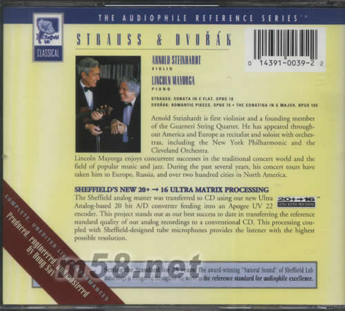 施特勞斯 德沃夏克小提琴與鋼琴奏鳴曲(珠玉之美的小提琴)(m58.net) Lincoln Mayorga林肯·馬約爾加 美國鋼琴家。1937年出生于洛杉磯。lincoln Mayorga是世界上在古典音樂領域和流行音樂甚至爵士音樂領域同時取得成功的極少數鋼琴家的化身。lincoln Mayorga就是這樣一位在這兩個方面都獲得非常贊譽的、難得的鋼琴演奏家。 基于這樣的才能,他成為了喇叭花的領導者之一。60年代末至80年代初,他擔任好萊塢的迪斯尼工作室的鋼琴師,為電影音樂演奏,配樂包括了古典、搖滾、爵士和鄉村音樂等各種風格的音樂。他曾與施泰因哈特、托馬斯、斯托爾茨曼(Richard Stoltzman)、施瓦茨(Gerard Schwarz)等藝術家,以及洛杉磯愛樂樂團、莫斯科愛樂樂團等樂團合作,曾在俄羅斯、歐洲、美國等許多國家的城市舉辦過音樂會。